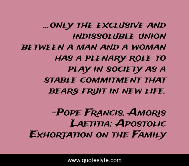 This page presents the quote "...only the exclusive and indissoluble union between a man and a woman has a plenary role to play in society as a stable commitment that bears fruit in new life.". Author of this quote is Pope Francis, Amoris Laetitia: Apostolic Exhortation on the Family. This quote is about catholicism, marriage, family,.