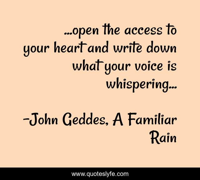 This page presents the quote "...open the access to your heart and write down what your voice is whispering...". Author of this quote is John Geddes, A Familiar Rain. This quote is about write, voice-whisper, open-heart, wisdom-inspirational,.