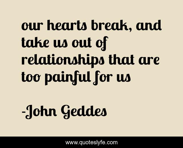 This page presents the quote "our hearts break, and take us out of relationships that are too painful for us". Author of this quote is John Geddes. This quote is about isolation, heartbreak, rejection,.