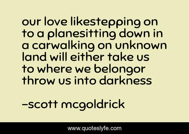This page presents the quote "our love likestepping on to a planesitting down in a carwalking on unknown land will either take us to where we belongor throw us into darkness". Author of this quote is scott mcgoldrick. This quote is about beautiful, unknown, singer, love, darkness, lyrics, songwriter, quote, musician,.