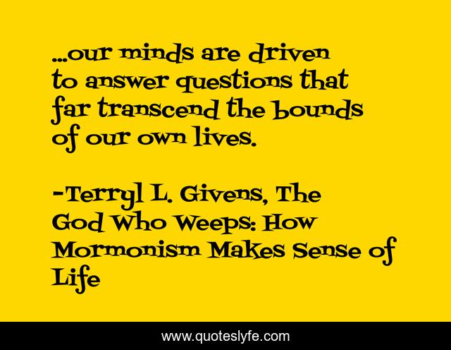 This page presents the quote "...our minds are driven to answer questions that far transcend the bounds of our own lives.". Author of this quote is Terryl L. Givens, The God Who Weeps: How Mormonism Makes Sense of Life. This quote is about spirituality, mind,.