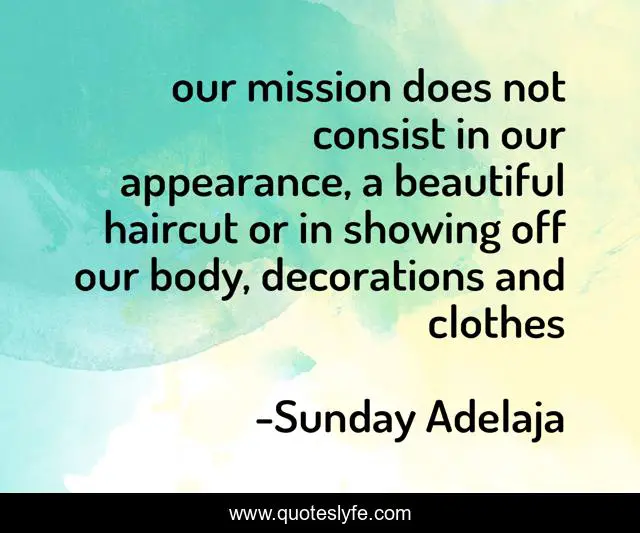 This page presents the quote "our mission does not consist in our appearance, a beautiful haircut or in showing off our body, decorations and clothes". Author of this quote is Sunday Adelaja. This quote is about body, appearance, mission, calling, decoration, purpose, clothes,.
