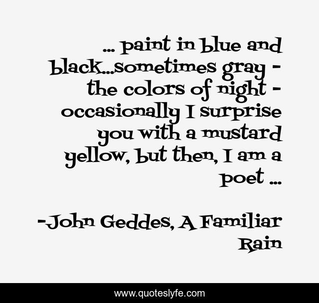 This page presents the quote "... paint in blue and black...sometimes gray - the colors of night - occasionally I surprise you with a mustard yellow, but then, I am a poet ...". Author of this quote is John Geddes, A Familiar Rain. This quote is about blue, gray, poetry, yellow, black, night, poet,.
