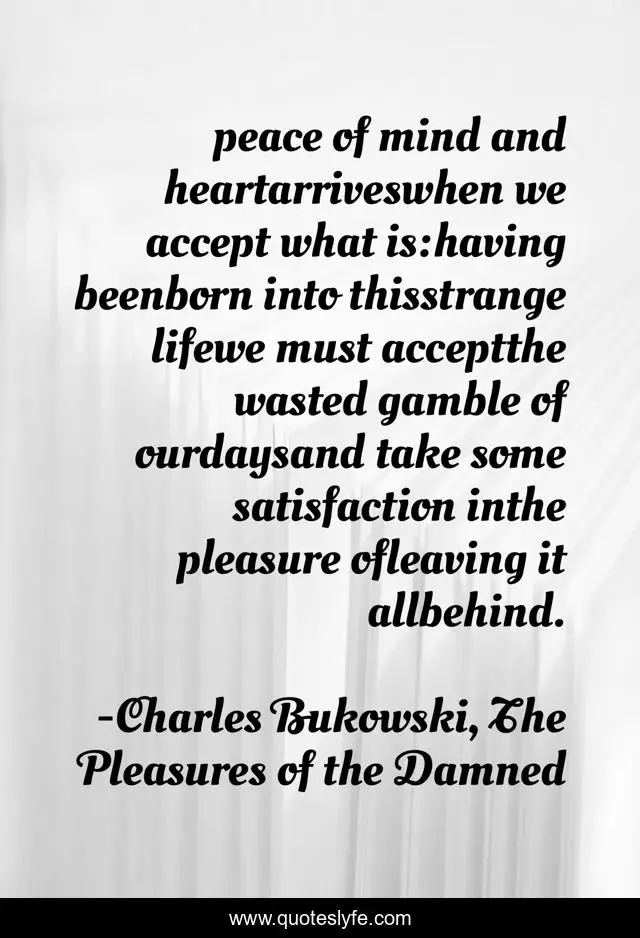 This page presents the quote "peace of mind and heartarriveswhen we accept what is:having beenborn into thisstrange lifewe must acceptthe wasted gamble of ourdaysand take some satisfaction inthe pleasure ofleaving it allbehind.". Author of this quote is Charles Bukowski, The Pleasures of the Damned. This quote is about life, life-and-death, charles-bukowski,.