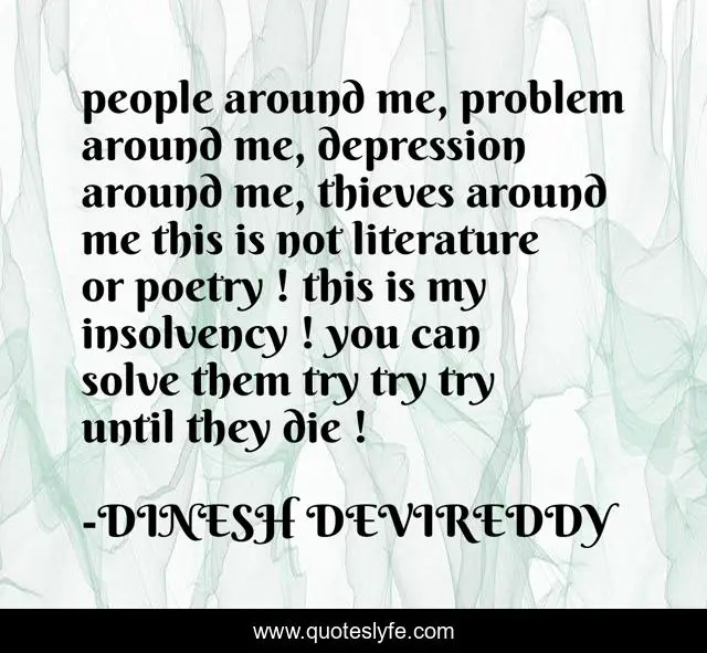 This page presents the quote "people around me, problem around me, depression around me, thieves around me this is not literature or poetry ! this is my insolvency ! you can solve them try try try until they die !". Author of this quote is DINESH DEVIREDDY. .