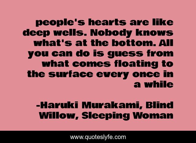 This page presents the quote "people's hearts are like deep wells. Nobody knows what's at the bottom. All you can do is guess from what comes floating to the surface every once in a while". Author of this quote is Haruki Murakami, Blind Willow, Sleeping Woman. This quote is about self, character, idea,.