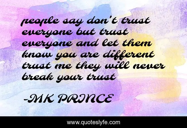 This page presents the quote "people say don't trust everyone but trust everyone and let them know you are different trust me they will never break your trust". Author of this quote is MK PRINCE. .