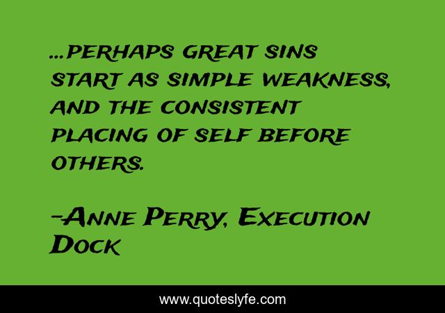 This page presents the quote "...perhaps great sins start as simple weakness, and the consistent placing of self before others.". Author of this quote is Anne Perry, Execution Dock. This quote is about selfishness, morality, sin, cruelty,.