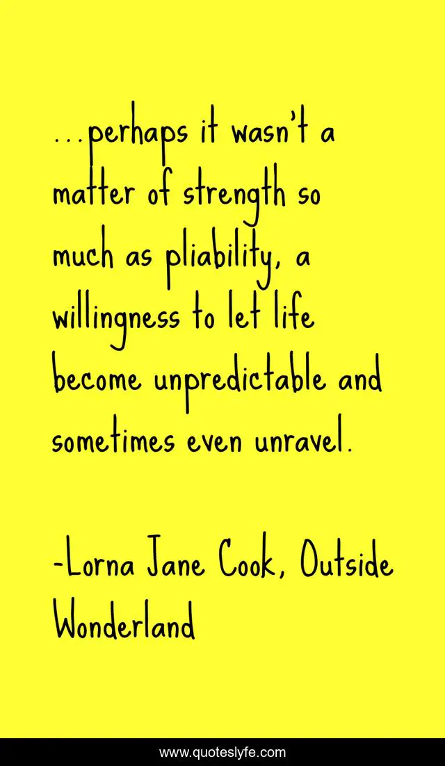 This page presents the quote "...perhaps it wasn't a matter of strength so much as pliability, a willingness to let life become unpredictable and sometimes even unravel.". Author of this quote is Lorna Jane Cook, Outside Wonderland. This quote is about strength, pliability-life,.