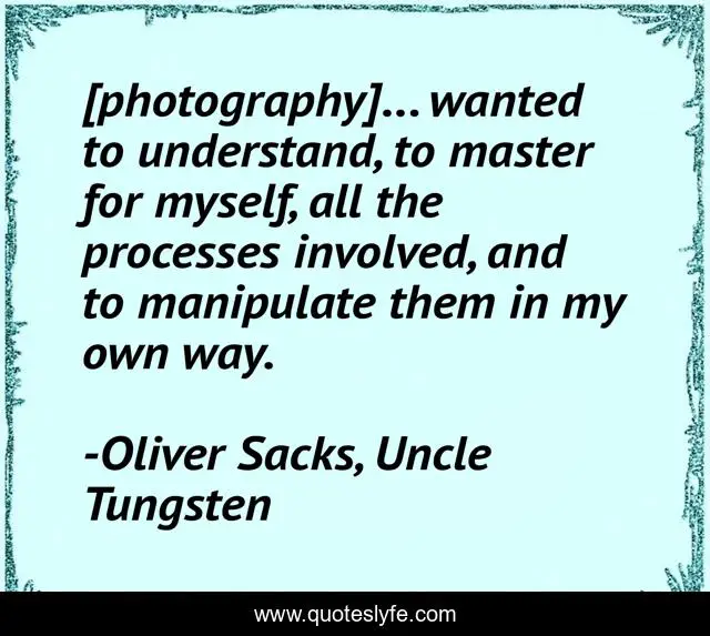 This page presents the quote "[photography]... wanted to understand, to master for myself, all the processes involved, and to manipulate them in my own way.". Author of this quote is Oliver Sacks, Uncle Tungsten. This quote is about science, photography, chemistry, childhood,.