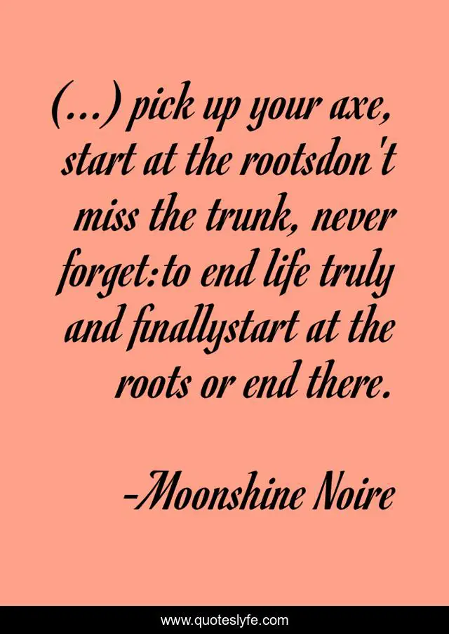 This page presents the quote "(...) pick up your axe, start at the rootsdon't miss the trunk, never forget:to end life truly and finallystart at the roots or end there.". Author of this quote is Moonshine Noire. This quote is about life, death, personification, nature, tree, hurt, suicide, determination, nihilism,.