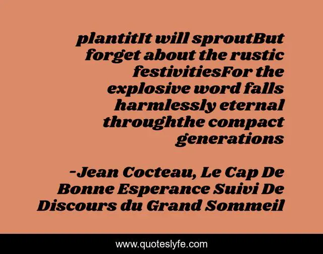 This page presents the quote "plantitIt will sproutBut forget about the rustic festivitiesFor the explosive word falls harmlessly eternal throughthe compact generations". Author of this quote is Jean Cocteau, Le Cap De Bonne Esperance Suivi De Discours du Grand Sommeil. This quote is about fertility, growth,.