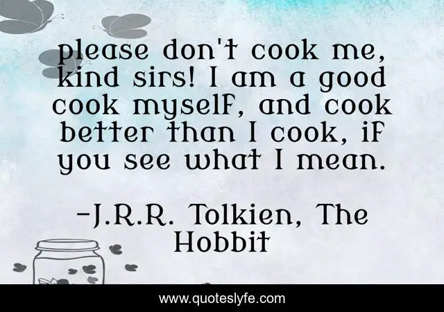 This page presents the quote "please don't cook me, kind sirs! I am a good cook myself, and cook better than I cook, if you see what I mean.". Author of this quote is J.R.R. Tolkien, The Hobbit. .