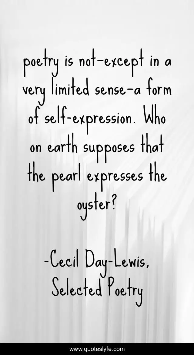 This page presents the quote "poetry is not—except in a very limited sense—a form of self-expression. Who on earth supposes that the pearl expresses the oyster?". Author of this quote is Cecil Day-Lewis, Selected Poetry. This quote is about poets, poetry, pearl, writing-poetry, poems, oyster,.
