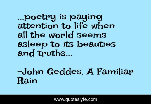 This page presents the quote "...poetry is paying attention to life when all the world seems asleep to its beauties and truths...". Author of this quote is John Geddes, A Familiar Rain. This quote is about life-and-living, reflection, truths, poetry, sleep, truth-of-life,.