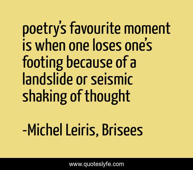 This page presents the quote "poetry’s favourite moment is when one loses one’s footing because of a landslide or seismic shaking of thought". Author of this quote is Michel Leiris, Brisees. This quote is about creativity, michel-leiris, poetry, writing,.