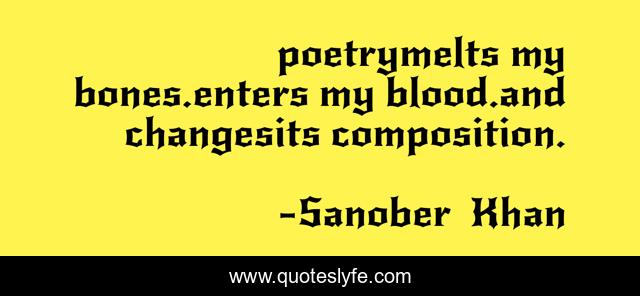 This page presents the quote "poetrymelts my bones.enters my blood.and changesits composition.". Author of this quote is Sanober Khan. This quote is about melting, poets, indian-authors, poetry, blood, bones, changing,.