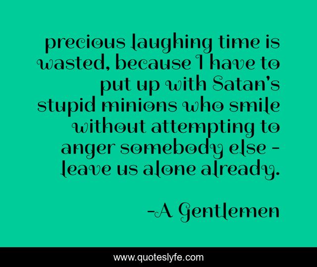This page presents the quote "precious laughing time is wasted, because I have to put up with Satan's stupid minions who smile without attempting to anger somebody else - leave us alone already.". Author of this quote is A Gentlemen. This quote is about madness, freedom, philosophy, sadness, inspirational, enthusiasm, history,.