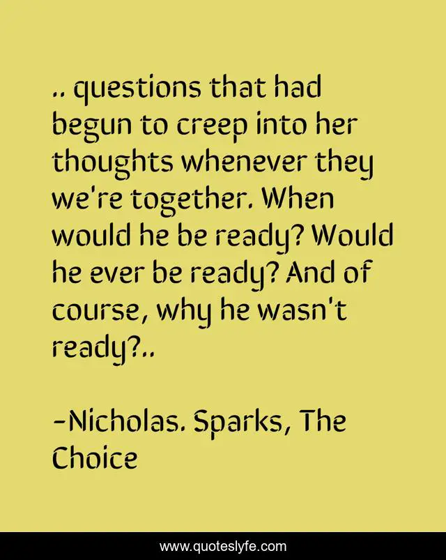 This page presents the quote ".. questions that had begun to creep into her thoughts whenever they we're together. When would he be ready? Would he ever be ready? And of course, why he wasn't ready?..". Author of this quote is Nicholas. Sparks, The Choice. This quote is about trust, love, commitment, affection,.