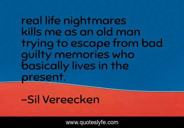 This page presents the quote "real life nightmares kills me as an old man trying to escape from bad guilty memories who basically lives in the present.". Author of this quote is Sil Vereecken. This quote is about nightmares, memories, life, transgender,.