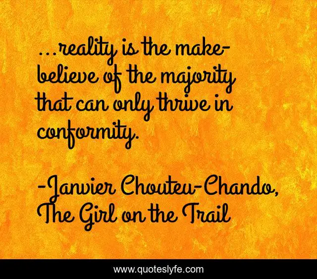 This page presents the quote "…reality is the make-believe of the majority that can only thrive in conformity.". Author of this quote is Janvier Chouteu-Chando, The Girl on the Trail. This quote is about friendship, humor, family, reality,.