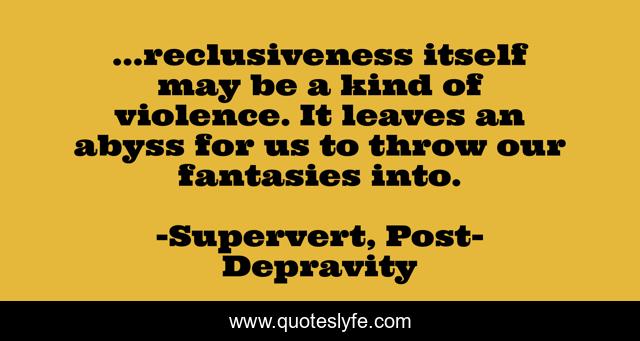 This page presents the quote "...reclusiveness itself may be a kind of violence. It leaves an abyss for us to throw our fantasies into.". Author of this quote is Supervert, Post-Depravity. This quote is about fantasy, violence, depravity,.