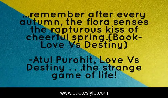 This page presents the quote "...remember after every autumn, the flora senses the rapturous kiss of cheerful spring.(Book-Love Vs Destiny)". Author of this quote is Atul Purohit, Love Vs Destiny . . .the strange game of life!. This quote is about faith, life, love, destiny, confession, crush, lust, romance, truth,.