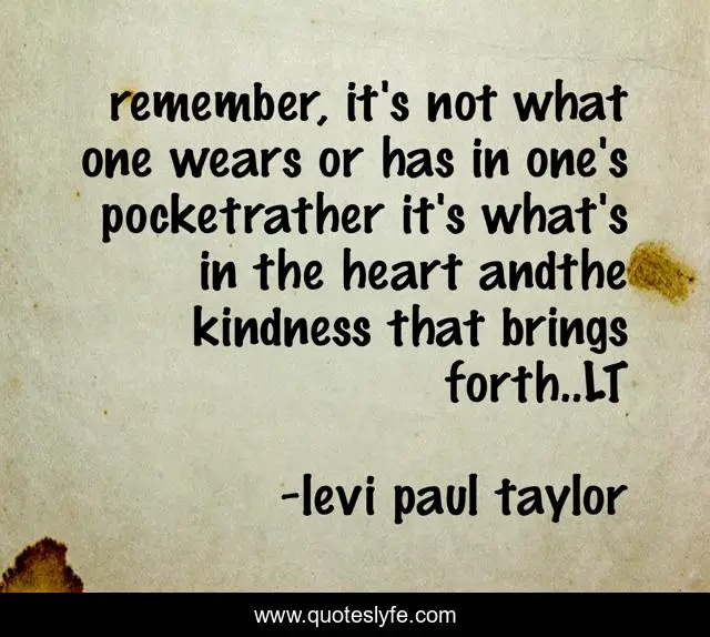 This page presents the quote "remember, it's not what one wears or has in one's pocketrather it's what's in the heart andthe kindness that brings forth..LT". Author of this quote is levi paul taylor. .