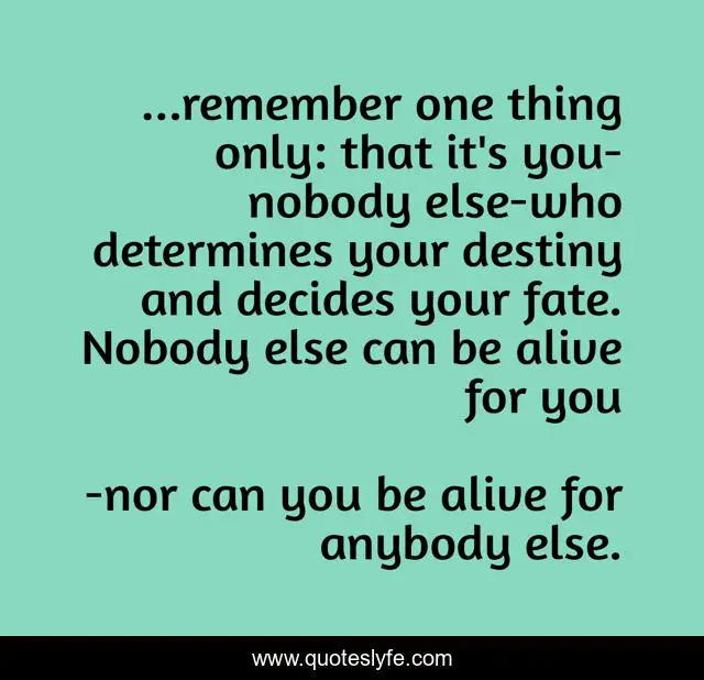 This page presents the quote "...remember one thing only: that it's you-nobody else-who determines your destiny and decides your fate. Nobody else can be alive for you". Author of this quote is nor can you be alive for anybody else.. .