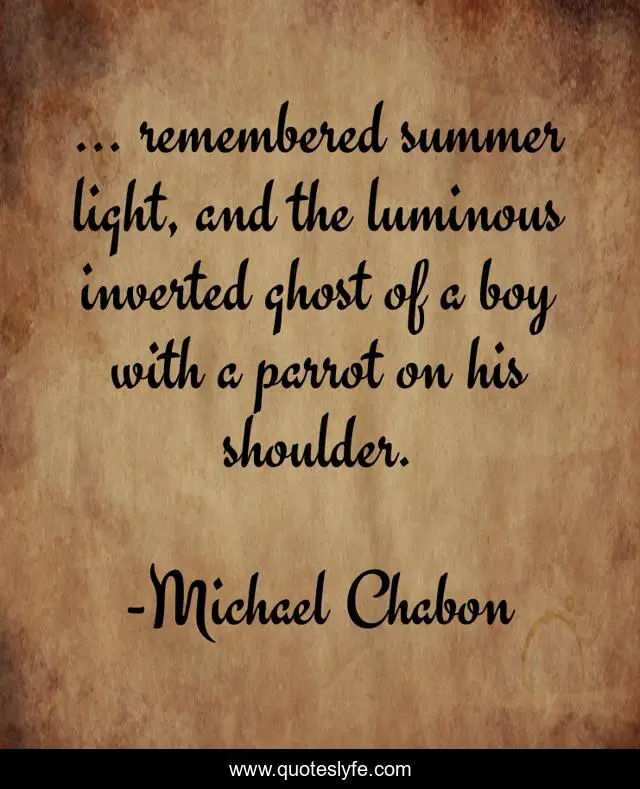 This page presents the quote "… remembered summer light, and the luminous inverted ghost of a boy with a parrot on his shoulder.". Author of this quote is Michael Chabon. This quote is about ghost, boy, light, vision, memory,.