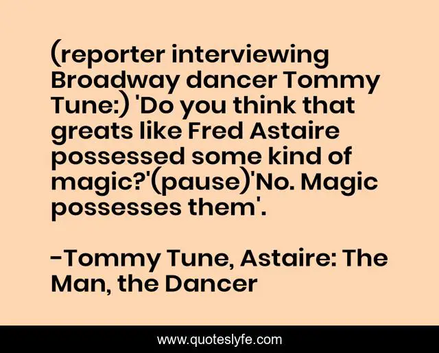 This page presents the quote "(reporter interviewing Broadway dancer Tommy Tune:) 'Do you think that greats like Fred Astaire possessed some kind of magic?'(pause)'No. Magic possesses them'.". Author of this quote is Tommy Tune, Astaire: The Man, the Dancer. This quote is about artistry, persona, talent, creativity, star-power, magic,.