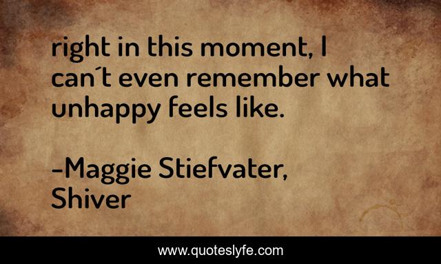 This page presents the quote "right in this moment, I can´t even remember what unhappy feels like.". Author of this quote is Maggie Stiefvater, Shiver. This quote is about giddy, happiness,.