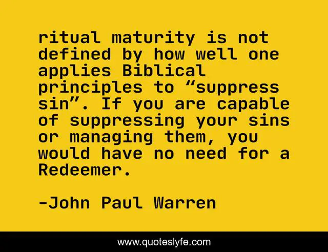 This page presents the quote "ritual maturity is not defined by how well one applies Biblical principles to “suppress sin”. If you are capable of suppressing your sins or managing them, you would have no need for a Redeemer.". Author of this quote is John Paul Warren. This quote is about the-church-of-south-florida, grace, john-paul-warren, pastor-john-paul-warren,.