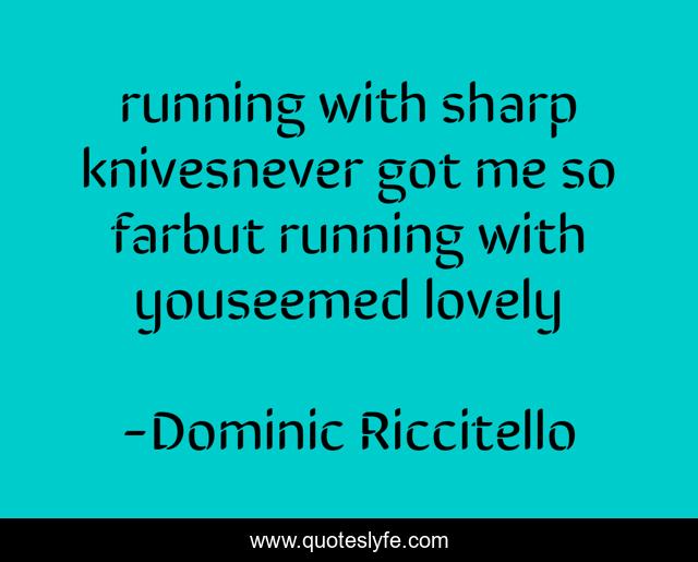 This page presents the quote "running with sharp knivesnever got me so farbut running with youseemed lovely". Author of this quote is Dominic Riccitello. This quote is about poem, life, short, love, bad, relationship, danger, quote, poetry,.