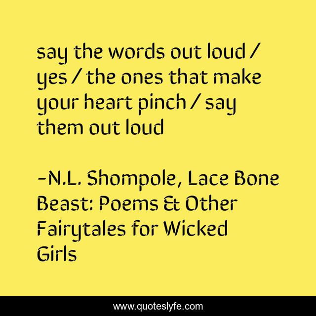 This page presents the quote "say the words out loud / yes / the ones that make your heart pinch / say them out loud". Author of this quote is N.L. Shompole, Lace Bone Beast: Poems & Other Fairytales for Wicked Girls. This quote is about poetry, fear, strength, lace-bone-beast, shompole,.