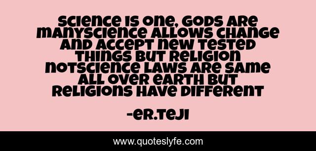 This page presents the quote "science is one, gods are manyscience allows change and accept new tested things but religion notscience laws are same all over earth but religions have different". Author of this quote is er.teji. .