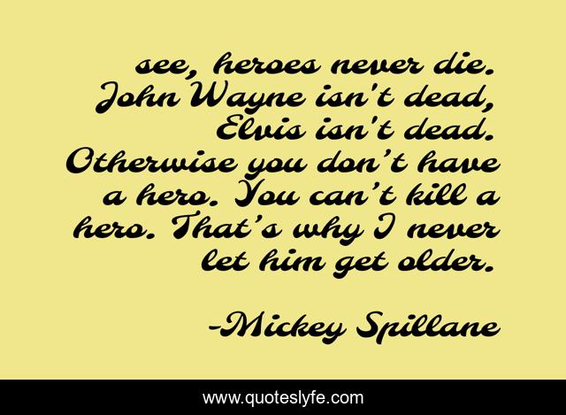 This page presents the quote "see, heroes never die. John Wayne isn't dead, Elvis isn't dead. Otherwise you don’t have a hero. You can’t kill a hero. That’s why I never let him get older.". Author of this quote is Mickey Spillane. .