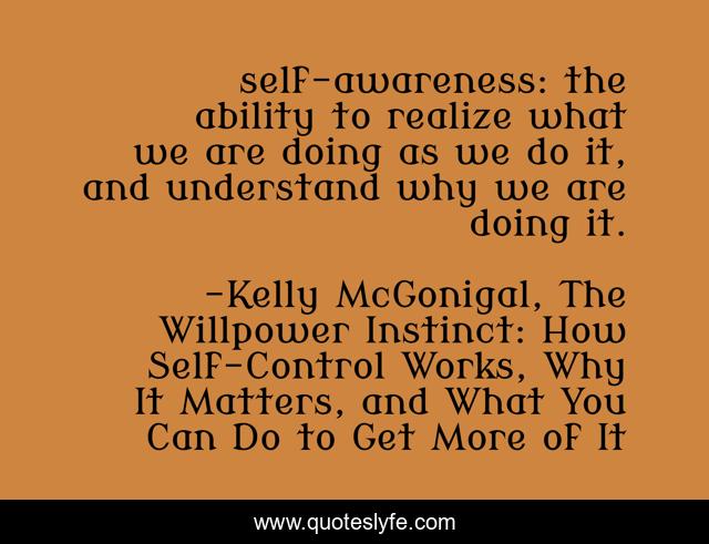 "Kelly McGonigal, The Willpower Instinct: How Self-Control Works, Why It Matters, and What You Can Do to Get More of It Quotes." Quoteslyfe.com, 2025. Sat. 06 Dec. 2025. <https://www.quoteslyfe.com/quote/self-awareness-the-ability-to-realize-what-160599>.