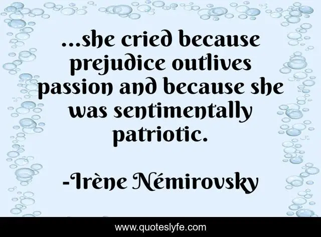 This page presents the quote "...she cried because prejudice outlives passion and because she was sentimentally patriotic.". Author of this quote is Irène Némirovsky. This quote is about patriotic, passion, prejudice,.
