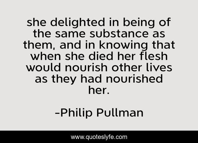 This page presents the quote "she delighted in being of the same substance as them, and in knowing that when she died her flesh would nourish other lives as they had nourished her.". Author of this quote is Philip Pullman. This quote is about nature, fantasy, death, novel, steampunk,.