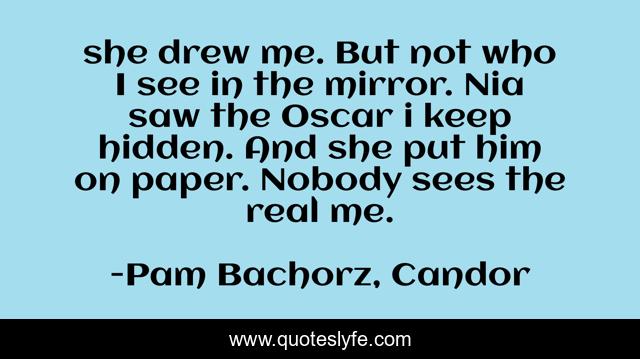 This page presents the quote "she drew me. But not who I see in the mirror. Nia saw the Oscar i keep hidden. And she put him on paper. Nobody sees the real me.". Author of this quote is Pam Bachorz, Candor. This quote is about sadness, thoughts, realization,.