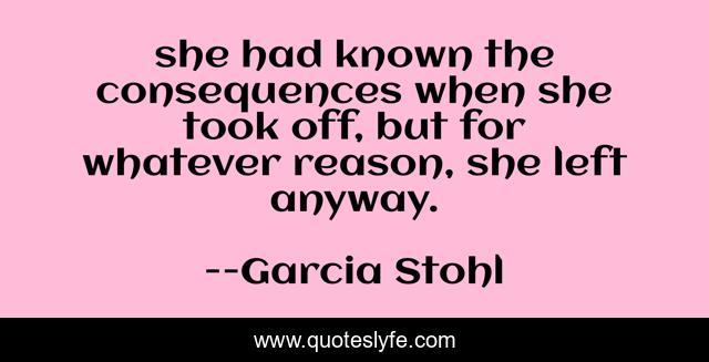 This page presents the quote "she had known the consequences when she took off, but for whatever reason, she left anyway.". Author of this quote is -Garcia Stohl. This quote is about beautiful, beautifulcreatures, consequences, creatures,.