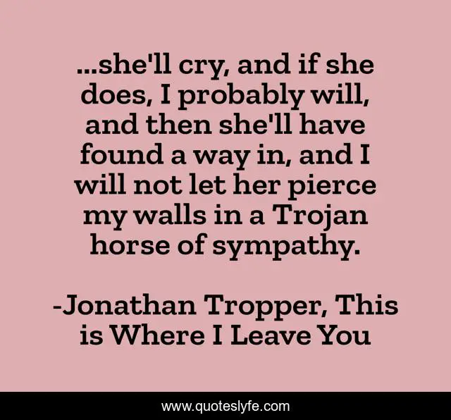 This page presents the quote "...she'll cry, and if she does, I probably will, and then she'll have found a way in, and I will not let her pierce my walls in a Trojan horse of sympathy.". Author of this quote is Jonathan Tropper, This is Where I Leave You. .