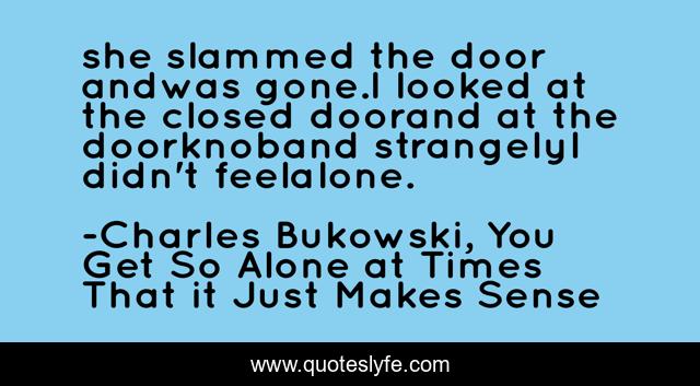 This page presents the quote "she slammed the door andwas gone.I looked at the closed doorand at the doorknoband strangelyI didn't feelalone.". Author of this quote is Charles Bukowski, You Get So Alone at Times That it Just Makes Sense. This quote is about loss, life, lonely, love, complete, inspiration, poem, loneliness, poetry,.