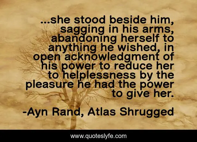 This page presents the quote "...she stood beside him, sagging in his arms, abandoning herself to anything he wished, in open acknowledgment of his power to reduce her to helplessness by the pleasure he had the power to give her.". Author of this quote is Ayn Rand, Atlas Shrugged. This quote is about pleasure, atlas-shrugged, dagny-taggart,.