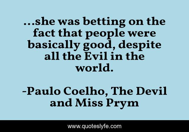 This page presents the quote "...she was betting on the fact that people were basically good, despite all the Evil in the world.". Author of this quote is Paulo Coelho, The Devil and Miss Prym. .