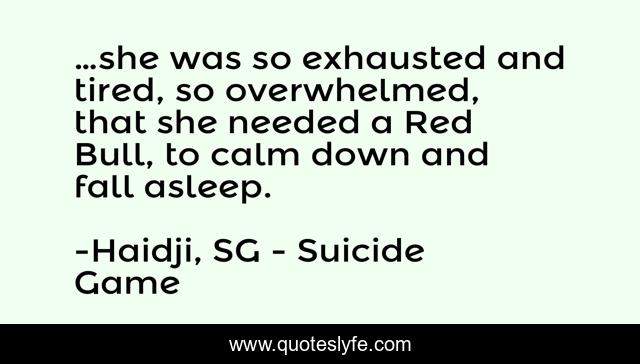 This page presents the quote "…she was so exhausted and tired, so overwhelmed, that she needed a Red Bull, to calm down and fall asleep.". Author of this quote is Haidji, SG - Suicide Game. This quote is about ebook, tired, exhausted, haidji, book, sleep, suicide-game, red-bull,.