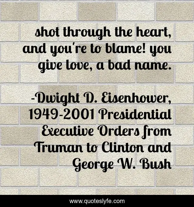 This page presents the quote "shot through the heart, and you're to blame! you give love, a bad name.". Author of this quote is Dwight D. Eisenhower, 1949-2001 Presidential Executive Orders from Truman to Clinton and George W. Bush. .