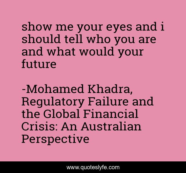 This page presents the quote "show me your eyes and i should tell who you are and what would your future". Author of this quote is Mohamed Khadra, Regulatory Failure and the Global Financial Crisis: An Australian Perspective. .