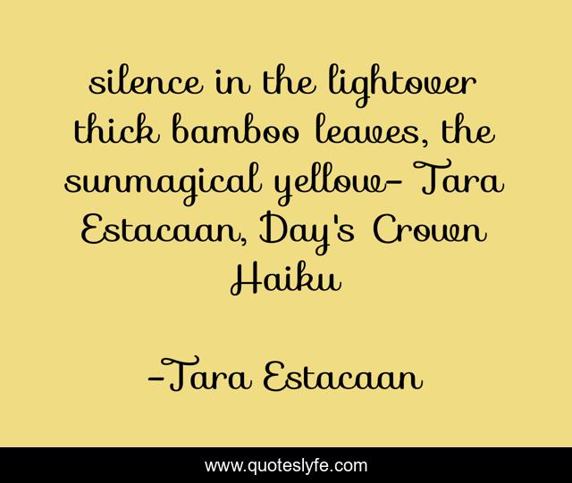 This page presents the quote "silence in the lightover thick bamboo leaves, the sunmagical yellow- Tara Estacaan, Day's Crown Haiku". Author of this quote is Tara Estacaan. This quote is about light, silence, sunlight, tara-estacaan, haiku,.